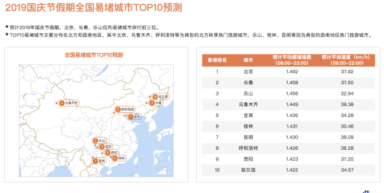 据《报告》显示,今年国庆节假期十大易堵城市主要分布在北方和西南地区。其中,北京、长春、乐山将位列前三。预计位于易堵城市榜首位的北京路网平均拥堵指数将达到1.492,路网平均速度将降至约37.92公里/每小时。十大易堵城市中,北京、乌鲁木齐、呼和浩特等为典型的北方秋季热门旅游城市,乐山、桂林、昆明等则为典型的西南地区热门旅游城市。