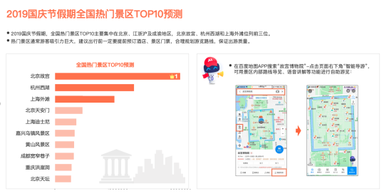 近日,百度地图联合交通运输部科学研究院、携程、中国天气网、百度百科发布《2019年国庆节假期出行预测报告》。