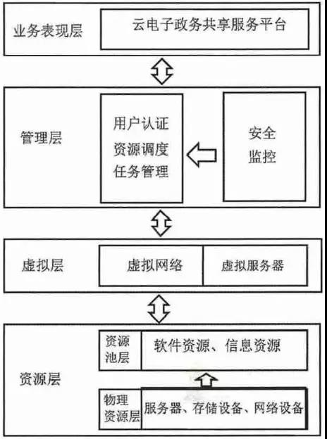 这四大层级也就是架构中的重要组成部分,合理安排资源、优化配置,共同建立一个真正服务大众的、结合中国特色与云计算环境下的云电子政务共享服务平台。