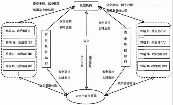 云电子商务是一种基于云计算的电子商务商业模式,是各种实体商务活动将云计算技术应用于商务领域,为了充分利用网络资源,可以高效且低成本地进行电子商务活动。在云电子商务平台上,分散的数字资源将会被整合成资源池,用户可以随时随地进行共享。而云电子政务就是云电子商务的一部分,而与云电子商务不同的是,由于云电子政务的特殊保密性,与传统交易式的电子商务不同,不同的云电子政务用户会根据其角色的不同的得到相应的数字资源领域的权限,在各自的领域内实现最大化的资源共享,使资源规整并且发挥最大的作用。