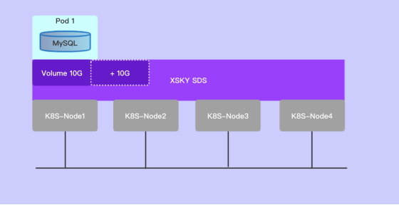 在磁盘容量告警,不足以满足当前业务的数据量时,XSKY CSI Driver 支持磁盘的动态扩容,不需要中断或暂停业务,达到随用随取的效果。