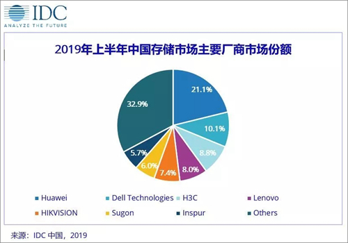 2019年上半年,华为市场占有率达到21.1%,凭借OceanStor V5产品系列排名市场第一, 同比增长35.5%;Dell Technologies的增长得益于其Symmetrix VMAX以及Unity系列产品在金融行业得到的认可,在金融行业存储需求占比达到24.9%,同时Symmetrix系列产品在制造业出货量也大幅提升,在整体存储市场排名第二;H3C则在全闪存和混合闪存产品上发力,在19年上半年达到11.7%的同比增长。