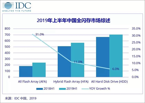 2019上半年,全闪存阵列(AFA)仍然是关键增长领域,同比增长31.0%,市场占有量达到15.8%。随着闪存容量单价的逐渐下降;在通用工作负载中的部署范围扩大;以及更重要的是,存储供应商的AFA产品组合日益丰富,AFA产品市场的竞争日趋激烈。随着AFA的采用增加,整体市场增长也遭遇了AFA蚕食HFA和仅HDD系统收入的障碍,特别是HDD阵列市场有望迅速下降,也导致了低端产品出货量大幅下降。