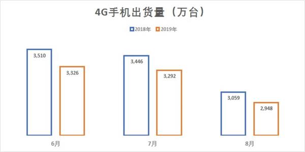 但分析中国信通院的报告数据,可以发现,自6月份5G商用牌照发放,国内手机市场从4G 向5G 过渡期正式开启以来,6-8月的4G手机出货量已经同比下降了4.5%,特别是8月份的4G手机出货量已经下滑到3000万部以下,比7月环比下降了10.4%。