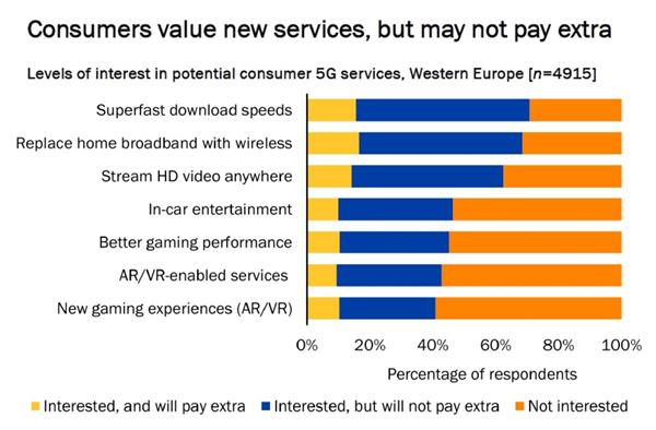 知名咨询机构Analysis Mason在西欧市场所做的调研报告显示,用户对于5G技术带来的高速下载、高清视频、AR/VR等应用感兴趣的比例非常高,但愿意为此额外付费的用户比例则仅有10%左右。