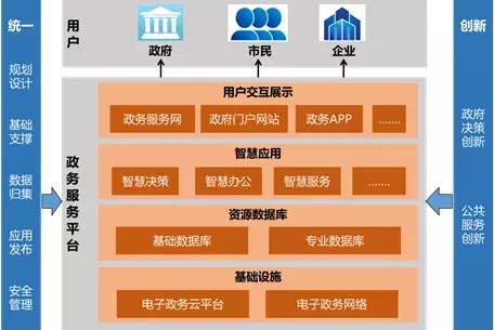 以政务服务网建设为契机,以政务智慧化为标志,建设我市统一的智慧政务服务平台。依据统一规划设计、统一基础支撑、统一数据归集、统一应用发布、统一安全管理的建设原则,整合电子政务网络、云平台等基础设施,建设人口数据库、法人数据库、地理空间数据库、电子证照数据库、宏观经济数据库等基础数据库及各类专业数据库,全面推进智慧应用建设,实现智慧决策支持、智慧协同办公、智慧公共服务、智慧监管等骨干应用,以政务服务网平台、政府门户网站、政务APP等为接入口,开创具有政府决策创新、公共服务创新的政务智慧化新格局。H市智慧政务建设总体框架如下图所示。