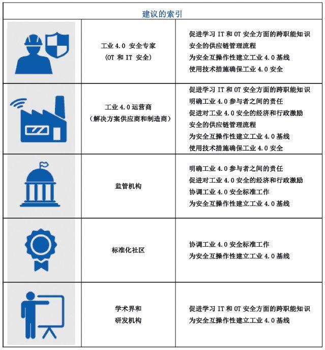 ENISA在报告中列出针对不同利益相关群体的高级别建议,以促进工业4.0网络安全,并以安全的方式促进更广泛的相关创新发展。不同利益相关群体包含与工业网络密切相关的组织机构:工业4.0 安全专家(OT 和IT 安全)、工业4.0运营商(解决方案供应商和制造商)、监管机构、标准化社区、学术界和研发机构。从人员、流程和技术三个领域分别阐述工业4.0网络安全面临的挑战,针对这些挑战提出能解决问题、操作性强、可具体实施的指导建议。整体报告偏重于战术层面的指导规范,以应用研究开发和技术创新为主导,旨在解决当前可以预见的在挑战和人才、流程和技术方面所面临的难题。
