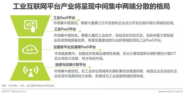 如前文所述,近两年国内工业互联网平台数量呈爆发式增长。国内ICT企业、工业软件服务商、设备提供商及制造企业纷纷凭借自身优势构建不同类型的工业互联网平台。各平台间相互合作,为企业提供一体化的平台解决方案。各类型平台的通用程度不同,通用性强的云服务及通用PaaS平台市场集中度高,将呈现寡头垄断的产业格局。工业属性强的连接与边缘计算平台、工业数据分析平台及工业PaaS平台市场集中度较低,但终将形成几家跨行业跨领域的领先平台与其它细分领域平台协同发展的局面。面向工业现场应用的SaaS平台市场集中度最低,将出现高度细分的局面。