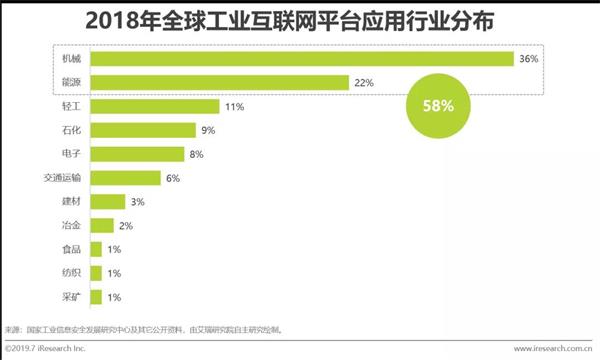 受限于数字化发展水平,各行业工业互联网平台的应用程度各不相同。数字化水平越高的行业,工业互联网平台的应用程度越高。整体来看,在国内外的应用案例中,机械与能源行业的工业互联网平台应用程度最高,累计占比高达58%。
