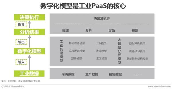 工业PaaS是工业互联网平台的核心,主要是其集成了工业数据分析与建模能力。工业数据分析是开启海量工业数据应用价值的钥匙,数据分析的深浅是决定数据应用价值高低的主要因素。工业数字化模型主要包括工业机理模型与大数据分析模型两大类。机理建模是基于工业技术原理,行业知识、经验及生产工艺等构建的数字化模型。大数据分析模型是基于工业数据本身的相关性构建的数字化模型。将工业数据输入模型以后,基于数字化模型可实现对实际生产及业务过程的描述,分析,预测,决策,以指导实际工作的精准执行。由此可见数字化模型是工业数据分析的核心,也是工业PaaS的核心。