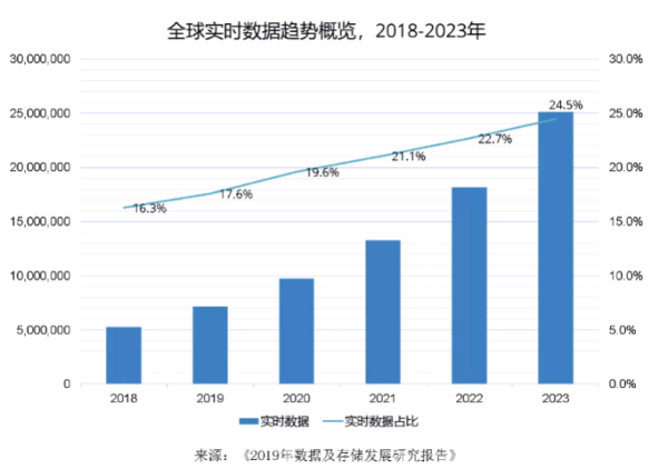 其次,数据的实时性需求变得更迫切。随着互联网、物联网以及人工智能等技术在各行业的不断渗透,企业对于数据实时性的需求日益增加。报告显示,到2023年,实时数据将占全球数据圈24.5%的份额。金融的风险评估、交通的自动驾驶、运营商的智能网络等许多场景,都需要依赖快速实时的数据采集、存储和分析得以实现。