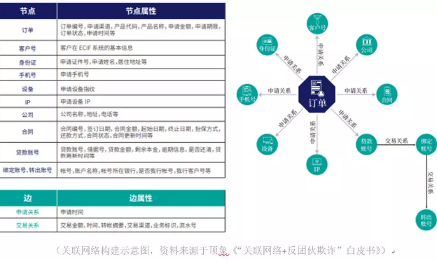 反欺诈手段,大致分为三类,一是通过活体识别、设备指纹、位置核验等核验身份、比对认证;二是对接黑灰名单及运营商、房产、车产、征信等外部数据核验;三是技术层面反欺诈,包括构建基于用户行为和业务流程的风险特征库,以及利用关联网络技术进行异常侦测。其中,关联网络最考验综合实力。