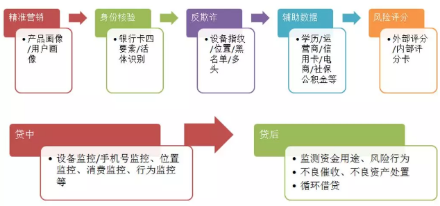 大数据风控不仅仅指信用评分、反欺诈等贷前审查环节,而是一套流程体系,涵盖从用户入口端的精准营销到贷后回款或催收管理的全流程。