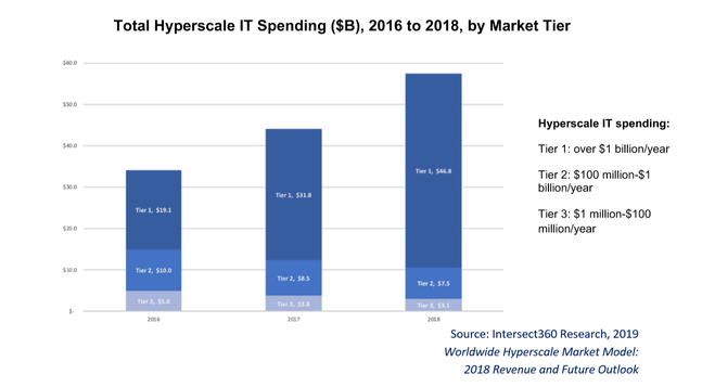 根据HPC和超大规模分析公司Intersect360 Research的数据,2018年全球超大规模市场的IT支出总计570亿美元,比2017年增长30%。