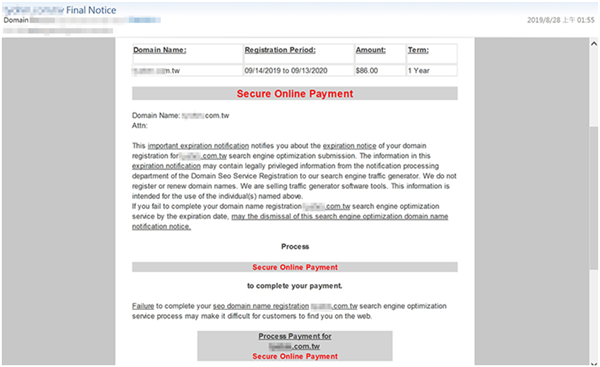 域名的注册、管理,应有固定的管理人员与监控流程;若真的需要购买、续用域名,应主动寻访合适的合作厂商协助,而非照着可疑邮件的指示进行。