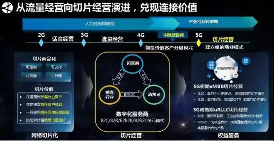 在业界看来,网络切片具有多种商业模式,包括B2B、B2C、B2B2C等。在大部分情况下,我们所提及的网络切片更多是针对行业用户提供B2B服务,而网络切片也可以直接向个人用户和转售商销售,如B2C面向个人提供差异化带宽前向切片服务,B2B2C面向虚拟运营商提供后向切片服务。