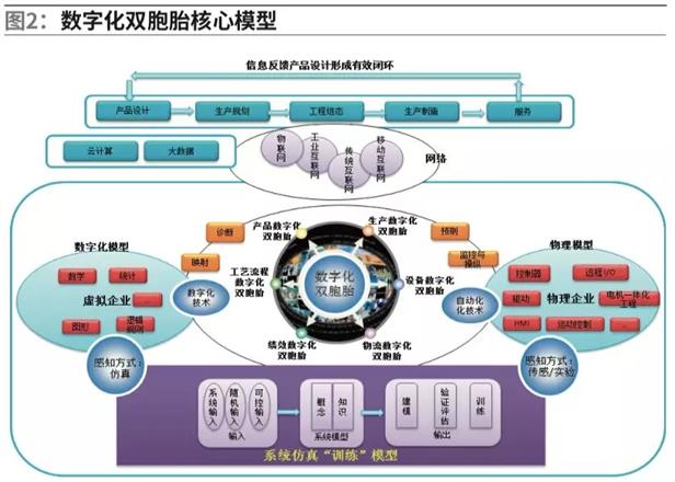 利用数字、统计、图形、逻辑规则等元素,通过仿真感知方式,采用数字化技术手段建立企业数字化模型,包括“产品数字化双胞胎”、“生产数字化双胞胎”、“工艺流程数字化双胞胎”和“设备数字化双胞胎”、“物流数字化双胞胎”以及“绩效数字化双胞胎”等,完整的实现企业场景、工艺流程、生产执行、故障处理、物流配送、设备执行、产品研发等的“画像”。采用自动化实现技术,通过传感、实验等感知方式,完成对物理企业的驱动、设备、远程I/O、HMI、移动控制、电机一体化工程等执行动作。从而实现虚拟企业和物理企业的互动。通过大数据平台对数字化双胞胎模型的处理,不断“训练”仿真模型,不断地优化仿真模型,充实仿真模型库,不断实现映射、监控与操纵、诊断、预测等的闭环优化与控制,使得整个智能制造涵盖的主体与对象不断的赋予智慧,从而实现智能制造。