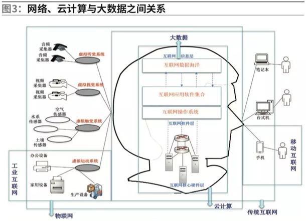 将物理设备连到互联网上,让物理设备具有计算、通信、精确控制、远程协调和自治等五大功能,实现虚拟网络世界与现实物理世界的融合。信息物理系统可以将资源、信息、物体以及人紧密联系在一起,从而创造物联网及相关服务,并将生产工厂转变为一个智能基础网络环境。包括传统互联网、移动互联网、工业互联网、物联网等。网络、云计算与大数据之间关系,如图3。