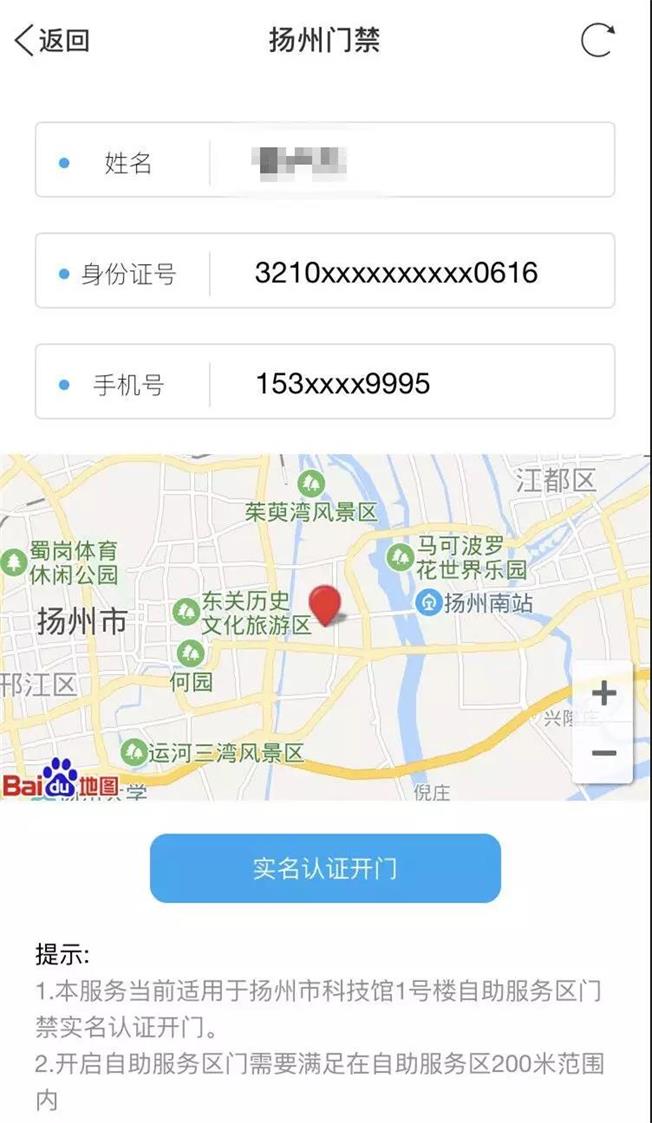 为提高自助服务区的安全性能,扬州24小时智慧政务大厅非工作时间采用智能化门禁系统,市民通过江苏政务服务APP实名认证登录后,扫描门口二维码即可进入门禁开门页面。凡是满足服务区范围的市民在确认个人基础信息后点击“实名认证开门”按钮自动开门,即可前往24小时自助服务区进行业务办理。