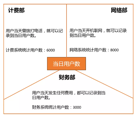 继续以电信运营商为例,对于运营商的“当日用户数”这个指标,各个部门给出的定义并不一样: