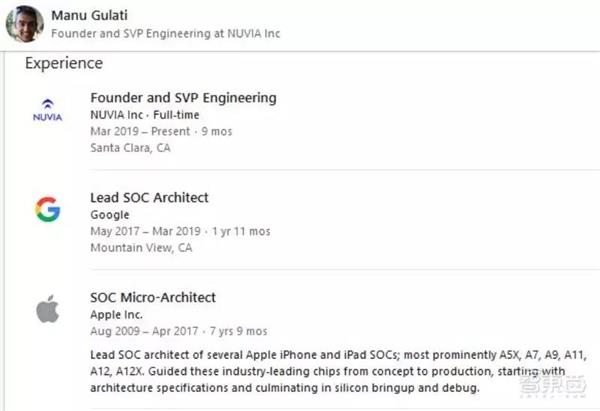 NUVIA的故事要从两头说起。首先是公司创始人的故事,其中包括John Bruno,Manu Gulati和公司CEO Gerard Williams III。这三人在苹果公司共事了很多年,在那里他们将各自的芯片技能集合在一起,共同领导各种计划,其中包括为iPhone和iPad设计苹果的A系列芯片。