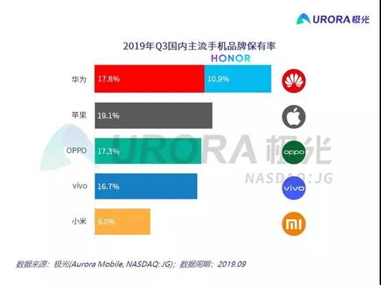 根据极光大数据,从2019 Q3国内智能手机保有率(存量用户占比)分布来看,国内手机市场由五大手机厂商占据,华为手机和荣耀手机合计保有率为28.7%,为业内保有率首位,与第二名苹果的保有率拉开近10个百分点的差距;OPPO和vivo保有率分别为17.3%和16.7%;小米保有率为9%。