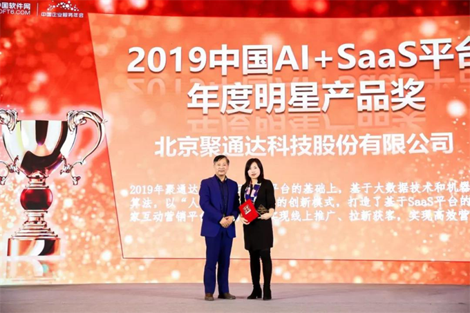 本次大会上,揭晓了2019企业服务年度人物奖、2019企业服务年度产品奖和2019企业服务年度企业奖三大类奖项。经过来自第三方机构、产业联盟、行业协会、媒体等100多位专家评审的层层筛选, 深耕技术领域多年的聚通达在众多品牌中脱颖而出,斩获了全场大奖 —— 中国AI+SaaS平台年度明星产品奖,成为全场焦点。