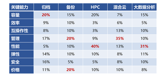 相对于2018年,2019年关键能力的打分权重有了显着的变化,这代表了业务对存储需求的变化。比如,随着混合云应用场景里管理复杂度的提升,2019年相关的打分权重出现了较大的变化,可管理性从2018的15%权重,提升到2019的35%,价格的权重也从8%提升到10%。