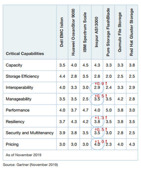 对各大产品的打分中,浪潮存储AS13000有5项关键能力对比2018有了长足的进步,其中互通从2提升到2.9分,管理从3提升到3.5分,弹性从2.5提升到3.8分,安全从3到3.5,价格则从3到4。这些关键能力大幅的提升,体现出浪潮存储AS13000的产品竞争力提升。