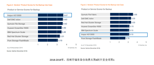 对容量和价格比较敏感的备份场景,是分布式存储的传统优势应用场景之一。而备份也是浪潮存储本次跃升最大的场景,从2018年的排名第六,一举跃升到了2019年的排名第一,说明了浪潮在分布式存储领域的发展速度。