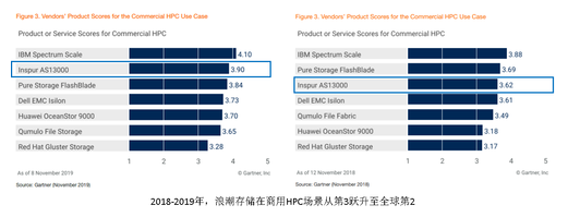 除此以外,在其他应用场景中,浪潮存储都有不同程度的提升,比如大数据分析就从第四跃升到第三,混合云存储场景则从第五跃升到第三,商用HPC场景从第三跃升到第二,归档场景从第五跃升到第二。