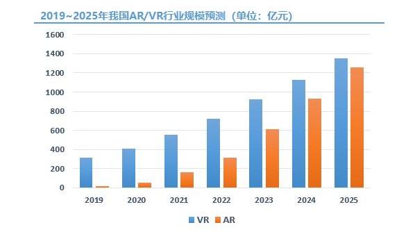 我国VR/AR产业当下也逐步趋于成熟,应用领域多分布在教育、医疗、休闲娱乐等领域。据统计,2018年我国VR/AR市场规模约为233.75亿元左右,同比增43.08%,其中VR占据主体,为227.5亿元。未来随着5G技术和政策的驱动,预计到2025年我国虚拟/增强现实技术的市场规模将分别达到1351.5亿元和1256.9亿元。