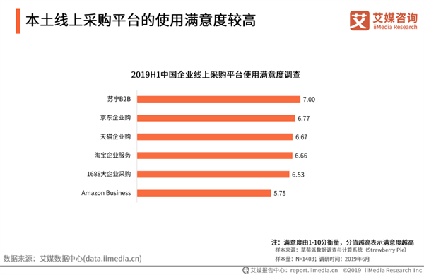 iiMedia Research数据显示,2019上半年,企业使用满意度最高的线上平台为苏宁B2B,评分最低的是Amazon Business。艾媒咨询分析师认为,苏宁B2B作为大型综合电商采购平台,线上线下渠道均有良好发展,一直将提供优质服务作为竞争力所在,因而使用体验较佳;而Amazon Business作为国外平台,在适应中国企业需求和提供专属服务上不如本土平台。