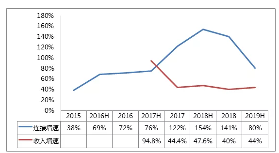 在过去两年的时间里,中国移动物联网连接数一直保持远超100%的速度增长,而收入增速基本保持在50%以下;但2019年上半年中,中国移动物联网收入增速依然保持在40%-50%的区间,连接数增速却降到了80%以下,下降的连接增速和上升的收入增速并存。可以看出,物联网连接背后带来的平均收入正在逐渐提升,ARPU值有所增加,2019年上半年,中国移动物联网业ARPU值为1.25元/月,这个数字相比2018年全年不足1.14元/月已经开始回升。