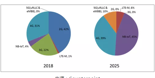 根据Counterpoint数据,到2025年2G/3G物联网连接数已接近忽略不计,因此在蜂窝物联网连接方式代际迁移过程中,原有2G/3G连接就只能由NB-IoT和4G来承接。其中,低频、小包、低移动性、时延敏感性低但对于成本敏感性较高的场景,可以通过NB-IoT来承接;中速率、对时延和移动性有一定要求、支持语音以及成本有一定承受能力的场景,可以通过Cat 1来承接。