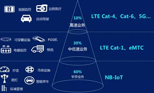 这个金字塔结构揭示了蜂窝物联网连接的分布:60%的物联网连接需要窄带网络提供服务,而中低速率的物联网设备需要Cat 1或eMTC网络提供服务,只有10%左右高速业务需要4G Cat 4以上或5G eMBB提供服务。回顾我们目前蜂窝物联网产业生态,可以明显的看出,窄带业务和高速业务已有成熟的网络和产业生态,而占比30%的中低速率物联网网络和相关产业生态还相对空白。因此,发展Cat 1网络及相关产业,对于补齐物联网主要场景需求很有意义。