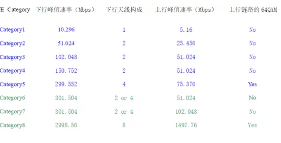 根据3GPP相关标准规范,UE category是一系列的在上行/下行中可变的无线性能参数的集合,包含了很多的无线特性,其中最重要的一个就是用户设备支持的速率。各种“UE Category”和支持速率的对应关系如下表中所示: