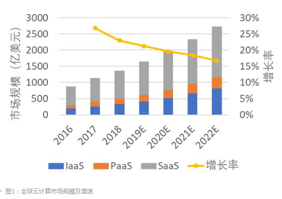 图1:全球云计算市场规模及增速(来源:Gartner,2019年1月)