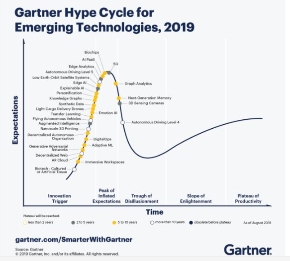 随着科技的快速发展,人工智能有了质的进步。从今年11月份华为公布了第一台5G手机,再到国家宣布投入5G研究费用,以及近年来各大企业投身电子汽车行业......可见5G、人工智能以及自动驾驶这几个词一直被业界所重视。然而大多也还是处于“探讨”阶段。那么现在它们都发展到了哪一阶段了呢?近期,Gartner在其发布的2019年度新科技的技术成熟度曲线中,进行了说明。