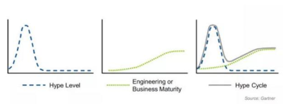 从下图可以看到,Gartner曲线由两条曲线叠加构成,一条反映了大众对技术的虚高期望值的“炒作程度”(Hype Level)曲线,另一条是工程或商业的成熟度曲线。基本上,炒概念和“讲故事”的新技术一开始会受到媒体的追捧,但一旦接受市场的验证,新技术此前宣传的泡沫将会慢慢被吹散,然后进入“高开低走”阶段,后面逐渐过渡至成熟期。