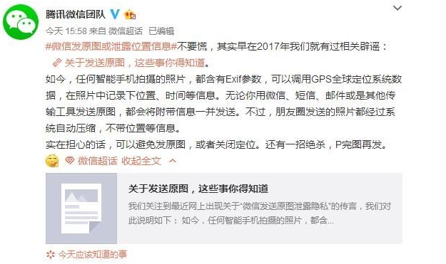 近日,有消息称,在微信发照片时选择“发送原图”,有可能会泄露拍摄时的位置信息。如果这些敏感信息被不法分子拿到,可能会进行一些诈骗。