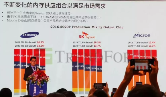 回顾整个DRAM市场,我们可以看到随着数字化转型,在2019年的时候,Server DRAM已经超过三成,我们可以大胆预测,在5G之后,Server DRAM的投产比重会跟行动式并驾齐驱,在2020年基于Server DRAM的应用会大于移动DRAM,在2025年会达到高峰,在Server DRAM这一块也是原厂目前最为着重的一个领域。