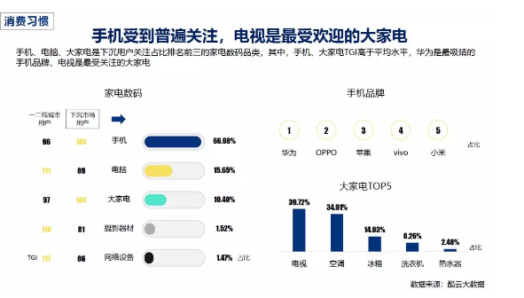 电子产品在下沉市场同样拥有广阔的发展前景。手机,电视和大家电在下沉市场的关注度都明显高于一二线城市,电脑关注度也与日俱增。