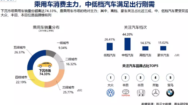 对于汽车行业,下沉市场也是“兵家必争之地”。下沉市场的乘用车销量份额已高达74.33%,是乘用车市场的绝对主力。其中,中档汽车最受关注,高档汽车的关注度近年来也呈上升态势。