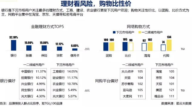 在理财偏好上,下沉市场用户讲求稳健,不喜欢追求过高风险。银行,尤其是大型国有银行,是下沉市场用户关注最多的理财方式。