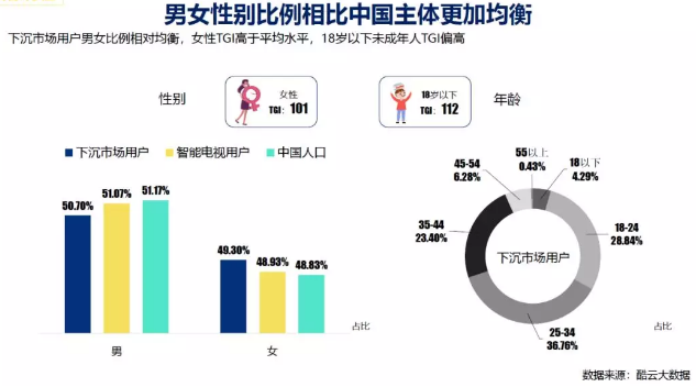 下沉市场用户的男女性别比例相比中国主体更加均衡。整体上看,全国智能电视用户男性多于女性,接近中国总人口的男女比例;而下沉市场的女性用户占比则略高于全国水平,这说明下沉市场的女性也拥有了“当家做主”的实力。