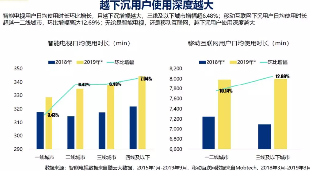 潜力的另一个表现在于:越下沉,用户使用深度越大。无论是智能电视还是移动智能设备,下沉市场用户的使用时长增幅,都明显高于一二线城市。