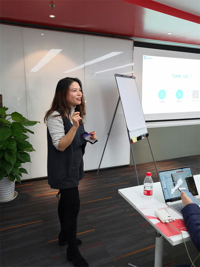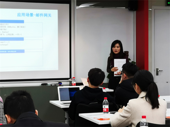 鞠月香女士分享了邮件安全领域的商机和发展趋势,并举例守内安产品的应用场景、市场分析、和具体案例解析。在演讲中她重点提到了守内安十几年来秉承的“3A”服务理念,它深深地影响了每一位在守内安的工作伙伴。通过这次培训活动,希望将这份理念和使命感传递给我们的合作伙伴,并得到他们的认同。