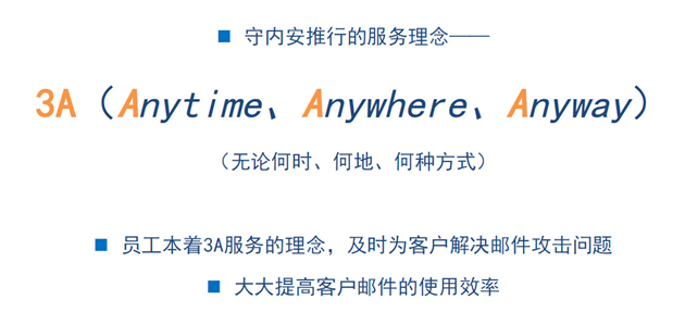 守内安作为邮件安全专家,专注于邮件风险管理和信息安全内控管理,以电子邮件安全管理为核心,研发了一系列“电邮安全与合规”为中心的核心产品线,衍生到威胁防御与联合防御体系。十四年来秉承“3A”服务理念(Anytime Anywhere Anyway),为企事业单位排除电子邮件管理上的困扰;多年的经验累积,树立了“服务?品质?值得信赖”的品牌理念,并持续实现高效、可靠、稳定和易用的安全管理方案,以满足用户在风险管理、内控安全等领域的需求。