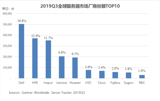 数据显示,排名前三的戴尔、HPE和浪潮出货量占比均在10%以上,出货量份额分别为16.8%、12.4%和11.7%。其中,浪潮实现销售额的两位数增长,为12.1%。在中国市场,浪潮市占率达38.7%,位居第一。